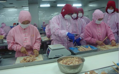 2013年7月23日早8:00,日本SK終端客戶在徐恩峰副總經理等領導的陪同下,對熟食一廠生區原料、配料、穿串車間;熟區加熱后、碳烤、單凍、包裝車間各區逐一進行檢查、驗證。客戶在檢查時,對原料儲存庫溫度控制,各車間懸掛的產品標準工藝照片、不銹鋼材質工器具的使用等細節管理非常滿意。與此同時,徐恩峰副總經理對產品烤后的焦點、加碳、換碳時間,碳火控制、碳火溫度管控等做了詳細的講解。